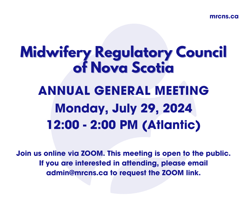 MRCNS will be hosting our annual general meeting online via ZOOM on July 29, 2024 from 12-2pm. The meeting is open to the public as well as all registered midwives (RMs).